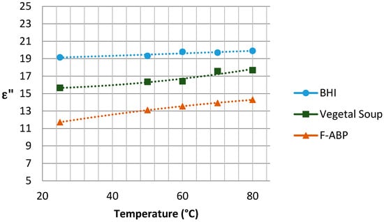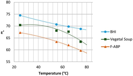 The graphs with the results concerning the dielectric constant (which defines the degree of polarization of the material to be subjected to an electric field) and the loss factor (which indicates the capacity of dissipation of electric energy within the material, demonstrated as heat [21]) are shown in Figure 5 and Figure 6, respectively, depending on the temperature reached in each test. Since the Dielkitv equipment does not allow pressurized measurements, the dielectric characterization of the products was limited under 100 °C. The selected materials are brain heart infusion broth (BHI), fish-based animal by-products (F-ABP), and vegetable soup, which consists of 30% vegetables, where the main ingredients are carrots, potato, celery, onions, tomato, turnip, pumpkin, corn starch, and dehydrated milk.