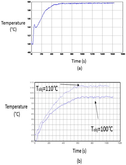Table 1 shows conditions for some of the experiments carried out. Under these conditions, the temperature profiles drawn in Figure 8 have been obtained. A 60 °C target temperature has been reached with no need of the pressure system. An error of −0.5% with a deviation of ±0.1 °C has been obtained. When the pressure system has been activated two examples for 100 °C and 110 °C have been reported. For these cases, errors of 1.7% and 2.2% with deviations of ±1.0 °C and ±1.1 °C were obtained, respectively.