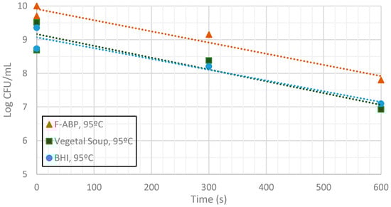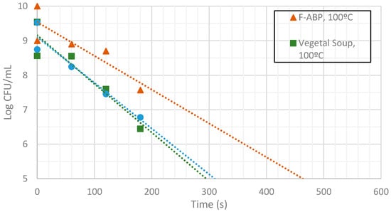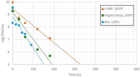 At 105 °C a fast inactivation is observed, with 3 log decimal reductions in less than 120 s in BHI, whereas to achieve the same inactivation in F-ABP more than 200 s are necessary, as Figure 11 shows. Vegetable soup required a time in between. Differences in heat inactivation can be explained by three main reasons: