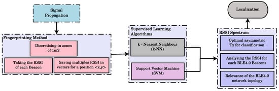 Most recent Bluetooth indoor localization systems are based on the Received Signal Strength Indication (RSSI) metric [,]. Recent studies have shown that Bluetooth Low Energy 4.0 (BLE4.0) signals are very susceptible [] to fast fading impairments. This fact makes it difficult to apply the RSSI-distance models commonly used in the development of Wi-Fi-based localization mechanisms [,]. Recent studies proposed alternative methods, as, for example, the use of Voronoi diagrams [] or the use of a probability distribution to match the best solution to the localization problem []. In the context of BLE4.0 beacons, in [], a proposal based on the use of an Isomap and a Weighted k-Nearest Neighbor (WKNN) is presented. As in previous related works [,], we explore the use of two supervised learning algorithms: the k-Nearest Neighbour (k-NN) and the Support Vector Machine (SVM) algorithms []. We go a step further by exploring the benefits of individually setting the transmission power as a means to improve the quality of the RSSI fingerprint to be used by the learning algorithms.