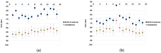It is worth mentioning that the sampling rate of the smartphone is limited to 15 samples/second, while we have set a sampling rate of the BLE4.0 antenna to 86.6 samples/second. In fact, we were unable to match the sampling rates of both devices. Figure 4a,b show the average and standard deviation of the RSSI values for BLE4.0 beacons ’Be07’ and ’Be09’, respectively, using . Since the purpose of this first experiment was to evaluate the capabilities of both mobile devices, the use of mid-power seemed to be the best choice. The figures show that the BLE4.0 antenna offers better results than the smartphone, higher RSSI levels and lower standard deviation.