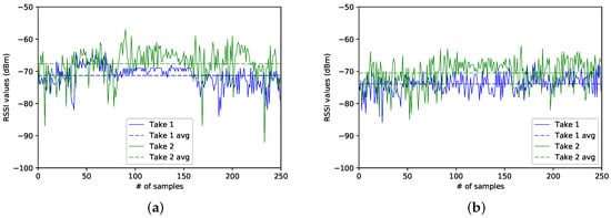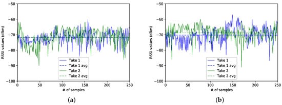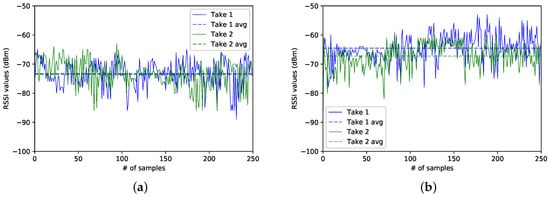 Figure 6a,b show the traces for both BLE4.0 beacons at Sector 4. In this case, BLE4.0 beacon ’Be07’ is closer to this sector than BLE4.0 beacon ’Be10’. However, as seen in the figures, the RSSI traces for BLE4.0 beacon ’Be07’ exhibit lower values than those reported for BLE4.0 beacon ’Be10’. It is also important to mention that, despite the captures for both beacons having been taken at different times, the average RSSI signal levels (dashed lines) of BLE4.0 beacon ’Be07’ for both traces were lower than the ones reported for the traces for BLE4.0 beacon ’Be10’. However, a more in-depth analysis of the impact of external actors over the signal should be conducted. For instance, a more in-depth study of the impact of the room occupancy and more importantly on how to integrate this parameter into the information to be fed to the classification algorithms should be studied.