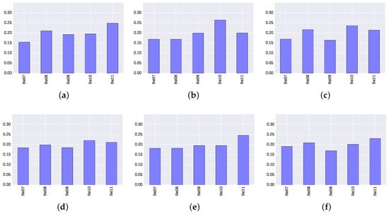 Relevance score of each BLE4.0 beacon for ExtraTrees algorithm for different transmission power () levels. (a) ; (b) ; (c) ; (d) ; (e) ; (f) .