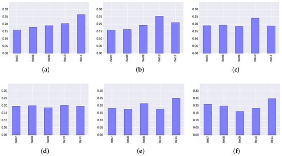 Relevance score of each BLE4.0 beacon for Gradient Boosting Classifier algorithm for different transmission power () levels. (a) ; (b) ; (c) ; (d) ; (e) ; (f) .