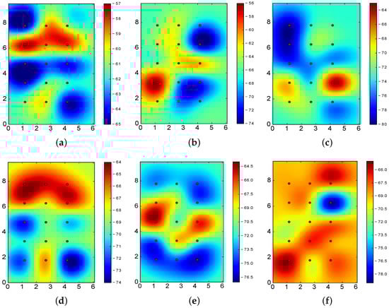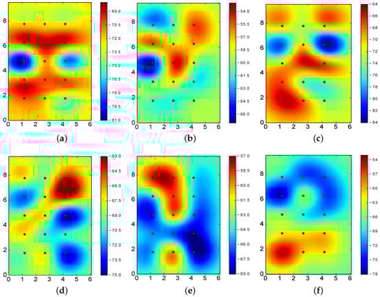 From the figures, it is clear that better results are obtained when the RSSI reported for the various sectors are clearly differentiated. In particular, Figure 10a–c allows us to properly identify the actual location of the BLE4.0 beacons: the highest RSSI value of the footprint is closely located to the BLE4.0 beacon. However, Figure 10d–f does not exhibit this feature: some of the highest RSSI values are reported far away from the actual BLE4.0 beacon physical location. More specifically, in all these latter cases, the highest RSSI values are reported at two different points. For instance, in the case of BLE4.0 beacon ’Be10’ operating at (see Figure 10f), the highest RSSI values are reported at two opposite corners of the experimental area. This signal impairment, known as deep multipath fading, is one of the main obstacles towards the development of robust and accurate BLE-based location mechanisms []. In the presence of multipath fading, the information to be derived from the RSSI values of each individual BLE4.0 beacons will definitely mislead the classification process.