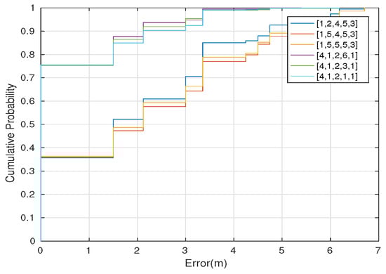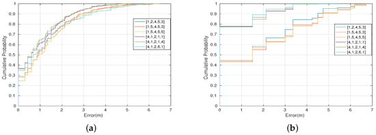 Figure 12 shows the overall cumulative positioning error for the three best and the three worst combined transmission power levels for k-NN, using both versions of the classification algorithm, namely, weighted distance (a) and mode (b). The most relevant transmission power level combination is the one with the configuration: BLE4.0 beacon ’Be07’ with , BLE4.0 beacon ’Be08’ with , BLE4.0 beacon ’Be09’ with , BLE4.0 beacon ’Be10’ with and BLE4.0 beacon ’Be11’ with , which, in the following, will be represented by for short. This vector contains the transmission power level assigned to BLE4.0 beacons ’Be07’, ’Be08’, ’Be09’, ’Be10’, and ’Be11’, respectively. The figure shows that this setting limits the positioning error to less than 3 m in 95% of the times, for both versions of the k-NN classification algorithm. For the worst configurations, the 95% of the cumulative error is achieved with errors of 4 m (WD) and 5.5 m (MD), respectively.