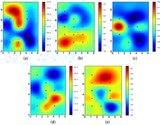 Similarly to the previous section, we carried out an analysis using the SVM algorithm. In this case, we found that the most relevant transmission power levels were exactly the same as for the k-NN algorithm: [4,1,2,1,1]. The global accuracy was 75.57% and the RSSI propagation heatmap is also shown in Figure 13.