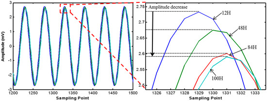 To quantify the signal variation, the amplitude of the harmonic wave is extracted as a feature of wave propagation. Figure 12 shows the amplitude changes of the two modules.