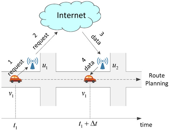 - The forwarding of assistant contents. In order to accelerate the transmission of assistant contents, when an assistant vehicle encounters other vehicles, it selects the neighbor in the same moving direction and nearest to the next roadside unit and then forwards the assistant content to this neighbor. As Figure 4 shows, a vehicle has an assistant content and its next roadside unit to meet is u. In V2V communication, has three neighbors, i.e., , and . According to the above method, since is the neighbor nearest to and moving for u, forwards the assistant content to . Furthermore, has a neighbor who requests this content, so replies to . It is apparent that the data forwarding helps to shorten the access latency.