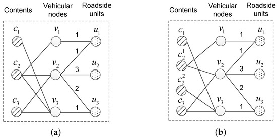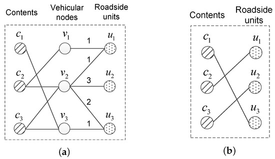 An instance is given to clearly demonstrate the above process. In a vehicular network with three vehicular nodes , three roadside units and three pieces of content , each roadside unit has only one storage cell. Figure 2a displays the content request relationships between the contents and the vehicular nodes in and the encountering relationships between the vehicular nodes and the roadside units in . The weight of an edge is the index of a roadside unit in those units which will be met in sequence by a vehicular node. For example, the edge linking and means that requests in , and the weight 3 of the edge linking and means that is the third roadside unit, which will meet in .