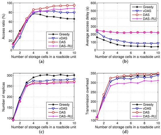 In order to show the influence of the storage size, let the number of storage cells in a roadside unit (, for ) range from 1 to 10. The simulation results of the four data acquisition models, i.e., Greedy, DAS, vDAS and DAS-RU, are illustrated in Figure 5. Since the contents are distributed according to the present network information in each storage cycle, the replication solutions in different cycles are independent. For a simple presentation of reliable results, the simulation results in all the cycles are averaged.