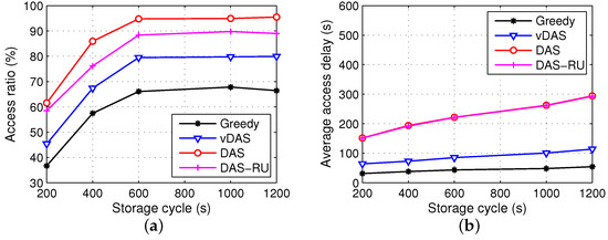 Results with different storage cycles. (a) access ratio; (b) average access delay.