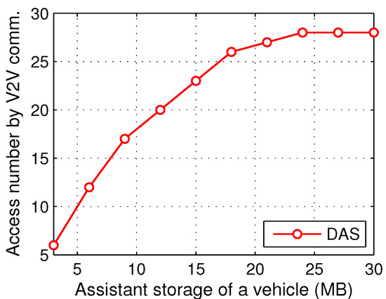 In conclusion, when , compared with Greedy, DAS has a higher access ratio and less storage cost by approximately 30% and 10%, respectively, with a longer access delay (the delay is around 37% of the content lifetime, which is acceptable in most vehicular services). In DAS, the supplementary storage at vehicular nodes increases the access ratio by about 6%. In addition, DAS has a high access ratio, while its variant vDAS has a short access delay. This implies that our data acquisition framework demonstrates different properties via adjusting the models of the preference and the priority. This flexibility may enlarge the application scope of our proposal.
