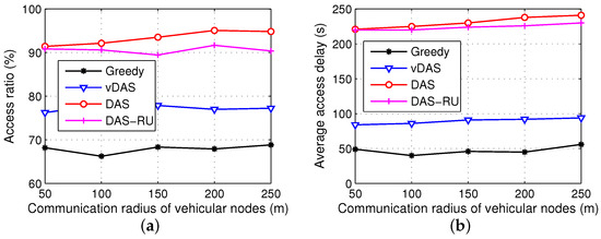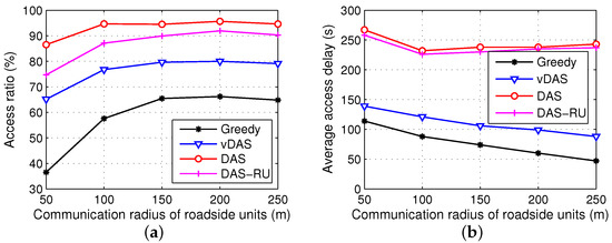 Results with different communication radiuses of roadside units. (a) access ratio; (b) average access delay.