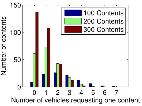 Considering that the random requests are rare in real life, in order to simulate more realistic data requests, a series of experiments based on Poisson distribution are developed. On the one hand, the number of requests from each vehicle follows a Poisson distribution with , and hence 100 vehicles totally have 235 requests. On the other hand, we set different numbers of contents as 100, 200, and 300, and the number of requests for each content follow the Poisson distributions with = 2.35, 1.175, and 0.783, respectively. If content has a large number of requests, it is regarded as popular content. The popularity distributions in the three scenarios with 100, 200 and 300 contents are shown in Figure 10, and the performances of the four schemes are illustrated in Figure 11.