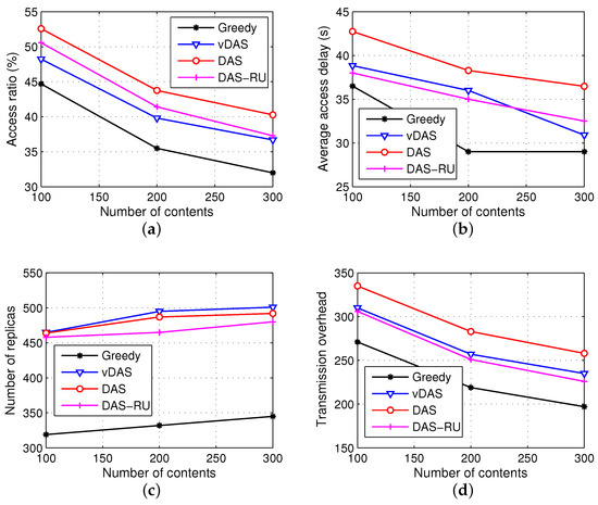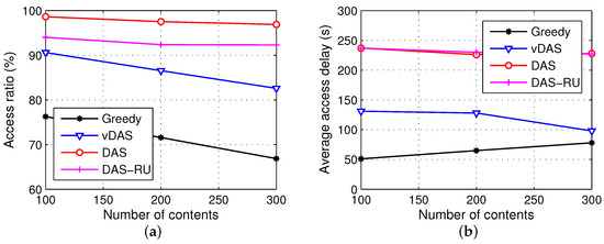 From Figure 5a, when the storage space is small, the access ratios of DAS and DAS-RU are almost the same, while that of vDAS is a little lower. The main reasons lie in two aspects: (1) in the Gale–Shapley algorithm, the preferences of left vertices (contents) play a more important role than the priorities of right vertices (storage cells); (2) since vDAS uses the encountering latency factor to compute the contents’ preferences, the benefits of the response factor (indicating the delivery ratio) wears off. In addition, when there are sufficient storage spaces, the access ratio of DAS increases to approximately 95%, while that of Greedy drops. This is because the stable matching algorithm improves the resource utilization. In addition, as the storage size increases, the ratio difference between DAS and DAS-RU becomes bigger because of the severe bandwidth competition around roadside units, which results in an obvious advantage of the supplementary storage at vehicular nodes. Overall, compared with others, DAS has a high and stable access ratio.