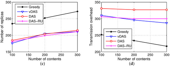 From Figure 11, a larger number of contents degrade the access ratio and bring in more replicas. Compared with the results using random requests in Figure 5, our scheme DAS with the requests following the Poisson distribution has a drop on the number of replicas because a replica of popular content may respond to multiple requests.