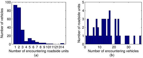 Since the encountering of vehicles and roadside units significantly affects the overall performances, we get statistics about the number of contacts. The distribution of the number of vehicles, which will encounter a specific number of roadside units, is shown in Figure 13a, while the distribution of the number of roadside units, which will meet a specific number of vehicles, is displayed in Figure 13b.