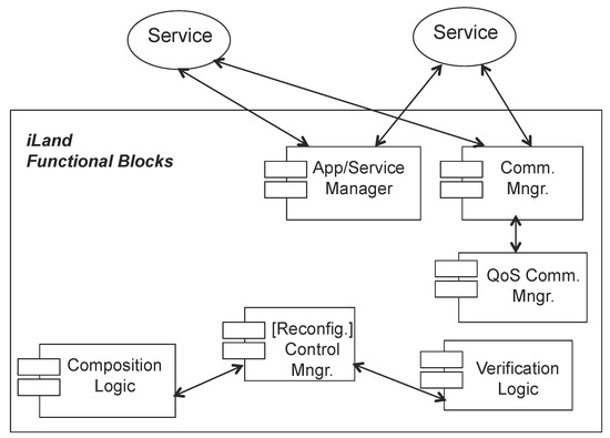 The interface between the application level (including an operator) and iLAND is at the level of the application/service manager and communication manager components. Applications or an operator can register services and configure specific applications with the App/Service manager; the communication among services is supported by the functions of the communication manager component.