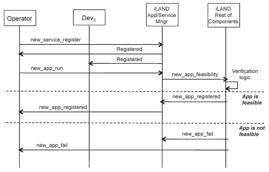 new_service_register) can then be granted. However, requests to run a new application (or to reconfigure an existing one) have to be checked for feasibility and correctness. The verification logic of iLand is run to make sure that the new application execution will comply with the requirements expressed in the invocation to