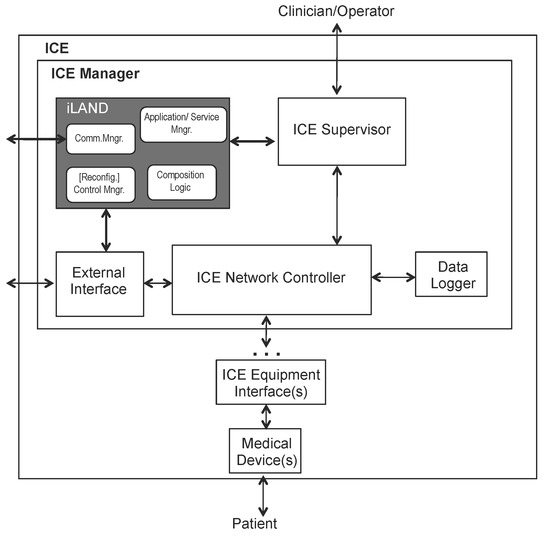 ICE is simply a generic architecture to design medical devices and services that can be easily interconnected. However, it only defines the general view of the basic components to interconnect devices among themselves and with a clinician or operator. Consequently, ICE does require the integration of specific software technology designs to: (1) enable flexible communications among devices; and (2) additional logic for improved behavior, such as the on line composition of services.