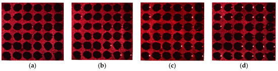 Microarray images obtained by digital microscope as a laser produces incident at different angles. (a) 0°; (b) 3°; (c) 5°; (d) 7°.