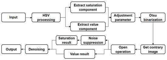 The HSV model is a color space that is relatively close to the color perception of human eyes. The color characteristics of each pixel are represented by three components: hue, saturation and value, in which hue and saturation contain the color information of the image and value represents the luminance information affected by illumination conditions [40]. For the reflected light image, HSV space can remove the correlation among components. It is necessary to combine the saturation component and the value component in binarization processing.
