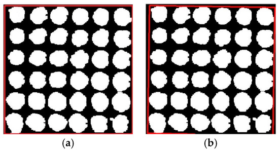 The value component was extracted from the HSV space of the original image. The same steps given above were applied to the value component. However, it is not necessary to suppress the bright object connecting to the image boundary, and the result is as shown in Figure 9a. The edge of Figure 9a still has some irrelevant white areas, so it is necessary to remove the irrelevant white areas by combining the processing results of the saturation component. Segmentation was taken for large areas, and small white noise and white parts connecting to the boundary were removed. The pretreatment result is shown in Figure 9b.