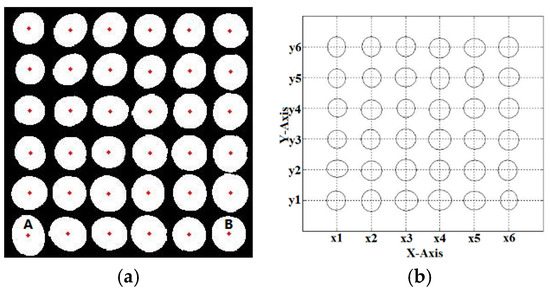 In order to address the above problems, a new segmentation algorithm is proposed in this paper. The reflected light image after rotation is binarized according to the method of the pretreatment stage. At this time, the edge contour is irregular, making it difficult to accurately reflect the scope of cells. It is necessary to take the ellipse fitting on cells based on the least squares method [54]. Then, the smooth boundary contour of the cells can be acquired. The image is segmented on the basis of extracting the edge contour of the cells. As shown in Figure 5a, at first, the ellipse fitting of the binarization image is performed after pretreatment. Then, regional analysis is carried out, and the centroid coordinates of each cell are recorded. In order to subsequent image analysis, it is necessary to make the interval and radius of dots equal after segmentation. Firstly, the center position must be determined. It is known that A and B are two points in the first line of Figure 5a. The abscissa is discretized and divided equally so that the horizontal distance between points is equal. Then, it can determine the abscissa of each column with X1, X2, X3, X4, X5, and X6. Secondly, all of the ordinates of the first row are averaged to acquire ordinate Y1. The points are placed in a row on the same lines and calculated according to formula (2). Then, the ordinate of each line is determined with Y1, Y2, Y3, Y4, Y5, and Y6. The result is shown in Figure 5b, and the distance of all center coordinates is equal: