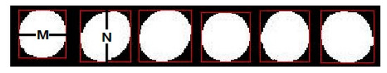 Then, the radius of segmentation is determined according to the rectangular box of the white cell area to determine the horizontal distance signed M and the vertical distance signed N, as shown in Figure 6. In order to ensure that the segmentation results are in the range of all cells, the algorithm divides the minimum value of the horizontal and vertical distance of each cell by 2 to obtain the circular radius. In order to eliminate the bright spots on the right side of the cells, the algorithm uses the method of multiplying by 0.9 to acquire the reduced radius for segmentation.