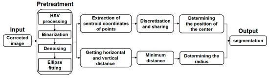 The monocrystalline silicon array is produced by lithography technology. Each cell is a circular and equidistant arrangement. However, in the process of preparation PSi microcavities, electrochemical etching causes the edge of each circular cell to become irregular. After laser irradiation, the image produces complex noise. These unique characteristics are different from fluorescent images, which makes image processing difficult. In addition, the optical structure of the cell edge region is different from the central region, which results in different reflectivity rates from the cell edge region to the central region [23]. Therefore, it is necessary to remove the edge of each cell (including bright spots) by segmentation. Based on the aforementioned problems, the reflected light image is preprocessed in this paper, and the reflected light image is corrected and segmented on the basis of pretreatment, whereas a new method for dots extraction based on the reflected light image of PSi microarray is developed.