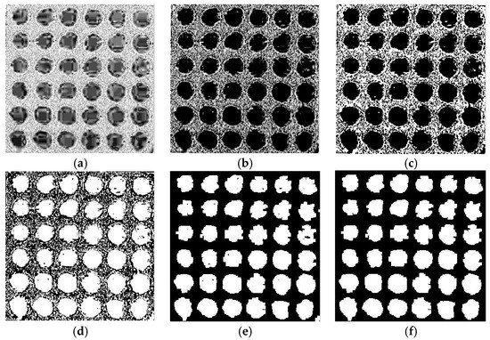 First, it is necessary to extract the saturation component, and the extraction result is shown in Figure 8a. In order to change the contrast and color of the image, it is necessary to adjust the parameters of the saturation component, and this adjustment result is shown in Figure 8b. The maximum between class variance method was selected to make achieve binarization of the saturation component on the adjusted image, and the result is shown in Figure 8c. After acquiring the opposite image and taking open operation, the results are shown in Figure 8d,e. At the same time, there were still some holes in the binary images that needed to be filled by morphology, and the bright objects connecting to the image boundary were suppressed. The processing result of the saturation component is demonstrated in Figure 8f.