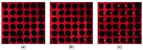 Porous silicon as an excellent biomaterial can be utilized to manufacture various kinds of photonic devices, which gives it excellent prospects for application to the field of biosensors [24,25,26,27,28]. The proposed PSi microarrays combine lithography technology with electrochemical etching. Each cell of the PSi microarray is a one-dimensional photonic crystal with defect layers (microcavities). If the biological reaction occurs in the microcavity, the refractive index will increase, which causes the defect state wavelength redshift [22]. For incident laser with a defect state wavelength, the reflectivity will increase. The change of reflectivity can be detected by the change of the image gray level of the PSi microarray. Therefore, based on the reflected light image of the PSi microarray, the biological response of each cell in the microarray can be quantitatively analyzed. The porous silicon microarray is different from the existing biochip based on measurement of fluorescence intensity of labels, and it can realize a high sensitivity refractive index detection only by detecting the gray value of the image of porous silicon microarray. Moreover, this detection is a parallel detection without a spectrophotometer. The image detection method based on the porous silicon microarray can be used to protein chips detection with low cost and high sensitivity.