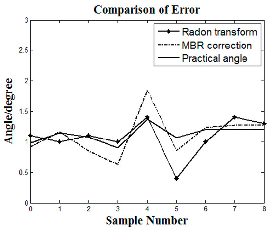 Figure 11 shows the error comparison of the two algorithms in dealing with the same experimental samples. The x-axis corresponds to nine test images and the y-axis is the angle of algorithm automatic detection. According to the experimental results, it is clear that the MBR correction algorithm shows good applicability and has an advantage in computing time for reflected light images processing. Compared with Radon transform, the algorithm’s error fluctuation is smaller, making it more suitable for the tilt correction of reflected light image.