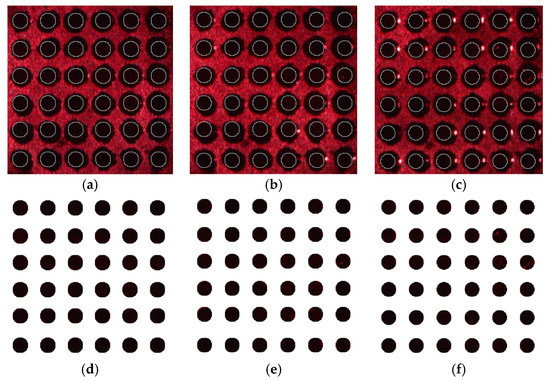 After binarization with the corrected images by the preprocessing method, and the ellipse fitting is performed. The center and radius of the circle can be obtained on the basis of binary image. Then, segmentation is accomplished. The experiment continuously selects three reflected light images with reflection angles of 0°, 3°, and 7°. The segmentation results are shown in Figure 12a–c. For the above images, the results of removing the background and extracting the segmented dots are separately shown in Figure 12d–f.