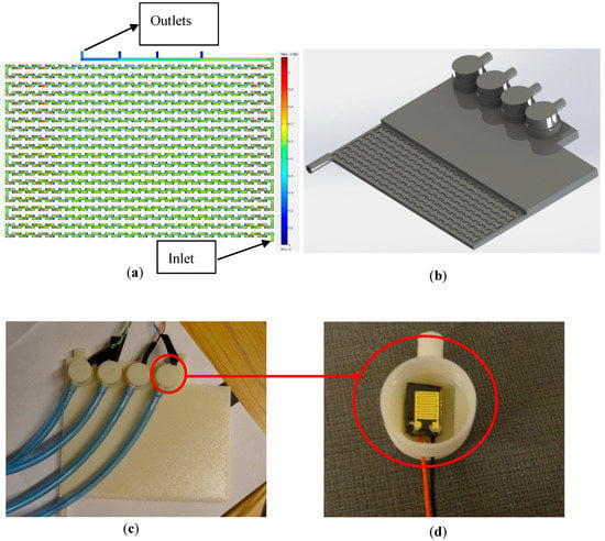 A commercially available desktop 3D design printer (Mojo 3D Printer, TRIMECH, Glen Allen, VA, USA) was used. The printer uses FDM® (Fused Deposition Modeling™) technology developed by Stratasys Inc. (Eden Prairie, MN, USA). Specifically, the printer has a 12.7 cm3 working stage with a deposition layer thickness of 0.17 mm and 2D spatial resolution of 0.07 mm. For the model presented here, a P430 ABSplus (ivory) Mojo QuickPack Print Engine [30] was used. For the void space inside the structure, a support material was used. This material was removed by dissolving it with a proprietary solvent provided with the printer (Soluble Support Technology was used to dissolve the support material in a water-based solution). The completed model along with the supporting material was placed in the WaveWash 55 Support Cleaning System (Stratasys Inc., Eden Prairie, MN, USA) along with an Ecoworks tablet (Stratasys Inc., Eden Prairie, MN, USA) and DI Water. The washing unit maintains the right solution temperature and agitation for efficient support removal, with no requirement for additional plumbing. The whole body of the 3D printed part did not have any infill as the structure was very thin (2 mm). The target of not using infill was to ensure that water does not leak through the top or bottom of the interface. The orientations of the 3D printed parts are as shown in Figure A1c. The orientation of the removable module is shown in the exploded view. These orientations were selected to minimize the amount of support material. The final fabrication time was about 4 h, followed by 12 h of washing to remove the support material. The serpentine channel with a very narrow cross sectional area (1 mm × 1 mm) required additional time for cleaning (more than 6 h recommended). Extra efforts were spent on removing the support material from the serpentine channel. The prototype was submerged into the solution for dissolving the support material overnight. Then, the solution was pushed through the serpentine channel with the help of a syringe. The solution was taken out by the syringe after a few minutes. The process of cleaning the serpentine channel interface was repeated until the flow through the interface was achieved. The approximate cost of fabrication by the printer used was around $50 CAD. The time taken for post processing was long (approximately 15 h). However, the presence of an individual was only required during the cleaning of the serpentine channel. Cleaning the serpentine channel required about 3 h, which adds to the cost of fabrication.