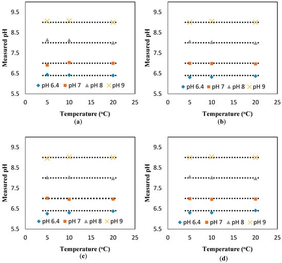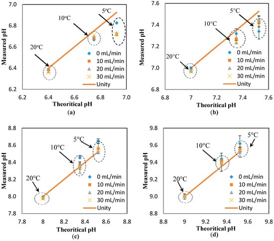 The results in Figure A5 also suggest a minimal effect of the flowrate on the response of the pH sensors. To further investigate this suggestion, the pH results measured at different temperatures (i.e., 5, 10, and 20 °C) and different flowrates are presented against the theoretical value (obtained at the static condition). The “unity line” is used to show the deviation of the measured values (at different flowrates) from the theoretical values (estimated at different temperatures, but the static condition). Thus, the closer the points to the unity line, the lower the effect of the parameter studied here (i.e., flowrate). Based on the results presented in Figure 3a–d, it is safe to conclude that the effect of the flowrate on the response of the pH sensor is minimal, even at the different pH ranges studied here (i.e., 6.4, 7, 8, 9). In fact, the maximum deviation from the theoretical value is 1.4%, which is in the range of the accuracy of the pH sensor developed here [8].