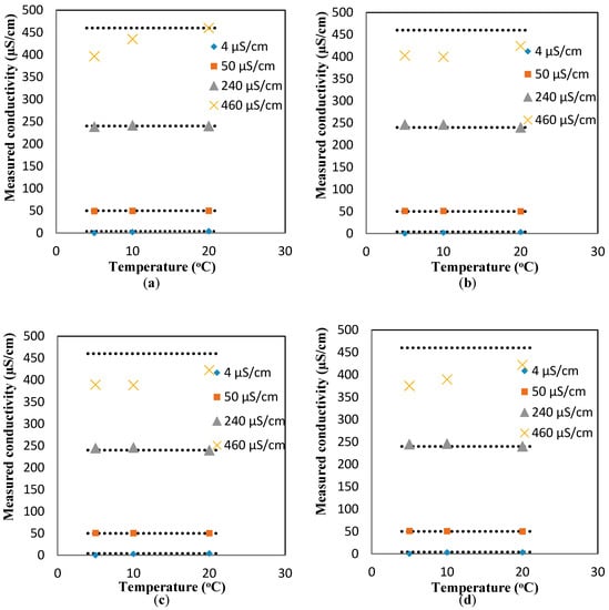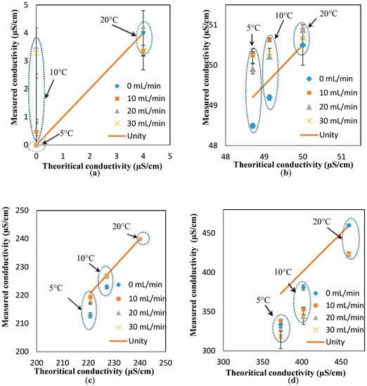 To investigate the effect of the flowrates on the response of the conductivity sensor, the “unity line” approach (similar to the pH results) is used to show the deviation of the measured values (at different flowrates) from the theoretical values (estimated at different temperatures, but the static condition). In essence, the closer the points to the unity line, the lower the effect of the parameter studied here (i.e., flowrate). Based on the results presented in Figure 5a–d, it is safe to conclude that the effect of the flowrate on the response of the pH sensor is minimal for most of the conductivity values and flowrates, expect for the measurements at low conductivity and high flowrates (4 µS/cm and 30 mL/min, respectively).