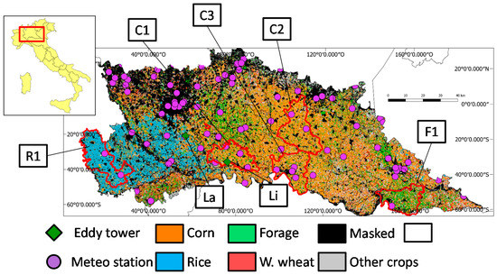 Distribution of the four major crop types in the 2011 summer season in the study area with the location of the meteorological stations (purple dots) and eddy towers at Landriano (La) and Livraga (Li) (green diamonds). Black polygon boundaries divide the region by its main agronomical districts, with the red ones highlighting six districts of interest for this paper (3.2.2) corresponding to: a rice district (R1: Western Lomellina), 3 Corn districts (C1: Codogno, C2: Western Bresciana and C3: Cremona) and a forage district (F1: Western Oltrepo Mantovano).