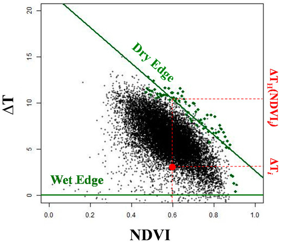 Methods for computing EF from satellite data generally rely on the evidence that the combination of Ts and NDVI is diagnostic of surface moisture condition [37]. In particular, in this study we used the approach proposed by Jiang and Islam [16], which is based on the relationship between NDVI and the air-surface temperature difference (ΔT = Ts − Ta). The ΔT vs. NDVI bidimensional space exhibits for a given day a triangular shape, bounded by the wet (maximum evapotranspiration) and dry (minimum evapotranspiration) edges [71] (Figure 2). The wet edge position corresponds to the x-axis (ΔT = 0) as established by the formulation of the latent heat flux [16]. The dry edge position is instead estimated as the regression line of maximum observed ΔT at discrete intervals of NDVI (green dots in Figure 2).