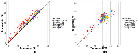 The reliability of the exploited NDVI, showed by the smoothed lines in Figure 3, is significantly increased by applying the multi-temporal smoothing process described in Section 2.2; yet this kind of filter cannot be used to Ta and Ts time series since daily fluctuations may be related to changes in surface/air temperature and a noise-reduction technique might cause a loss of valid information. Scatter plots between in situ and estimated air and surface daily temperature are shown in Figure 4 and regression parameters are summarized in Table 1. Globally, estimated Ta shows a very good accordance with data measured at the EC towers (r2 = 0.95; ME = 1.37) with the exception of the Landriano site in 2010 (red dots in Figure 4a), which shows a noticeable overestimation (ME = 2.94, Table A1 in Appendix B). This good agreement is favored by the spatial homogeneity of air temperature over flat areas such as the Lombardy plain [80]. Moreover, both towers are surrounded by a very dense meteorological network with at least five stations in a range of 15 km around each tower (purple dots in Figure 1) thus making Ta interpolation robust.