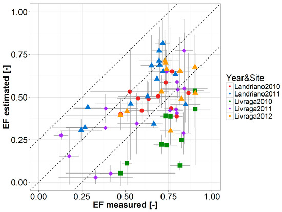 Satellite EFw values are generally lower than EC derived EFw, with an overall ME of −0.15, best (worst) performance are observed over Landriano 2011 (Livraga 2010). These results are consistent with Lu et al. [81], but opposite in sign to those obtained by de Tomás et al. and Peng and Loew [23,82]. This uncertainty in EF estimation may be related to the difference between the 1 km pixel size of MODIS maps used as inputs and the footprint of the EC towers (120 m2 in Landriano and 140 m2 in Livraga) [64]. The area surrounding the towers is fragmented and heterogeneous in terms of crop type: on average, corn covers 36% and 21% of the 1 km MODIS pixels at Landriano and Livraga, respectively. In these conditions, the 1-km Ts and NDVI values derived from MODIS are influenced also by the characteristics of the areas surrounding the EC towers, thus making the comparison with field-estimated EF difficult.
