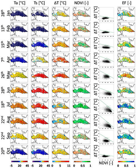 Figure 6 shows examples of daily Ta, Ts, ΔT, NDVI and EFd maps for 10 representative clear-sky dates in 2010. No maps are showed for December and November because no cloud-free data were available. Ta and Ts maps highlight the climatic variability of the study area, with cold winter months, mild spring and hot summer; ΔT maps show the highest values between April and May, in relation to the presence of vast bare soil areas associated with increasing incoming radiation and temperature. NDVI maps depict the growing season of the major summer crops, with the peak of vegetation greenness between June and August (NDVI > 0.5). They also highlight areas where forage and winter wheat are cultivated (October to February), mainly in the central/eastern regions of the study area. The fifth column of Figure 6 shows the ΔT vs. NDVI scatterplots derived from the input maps and used for EFd computation, with the dry-edge shown as a green line. It can be observed that the dry-edge slope and position show a strong seasonal variability due to the succession of warm months with pixels characterized by ΔT above 10 °C and cold months when the difference between soil and air temperature is usually low (see Appendix C for a more detailed analyses of dry-edge seasonal variability).