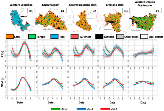 Average weekly EF and NDVI for three years (2010–2012) over five agronomical districts characterized by different main agricultural land uses. Colored lines correspond to smoothing splines of weekly averages with 95% confidence intervals overlaid in grey The top row shows the major crop types of the districts as extracted from the CUUA land use map.