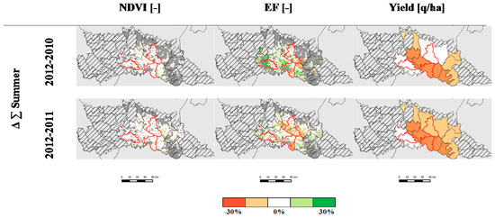 Figure 8 shows inter-annual difference, 2012 vs. 2010 and 2012 vs. 2011, of weekly NDVI and EF values cumulated from June to August (Δ∑Summer) and maize yield for the corn agronomical districts. Cumulated EF shows areas with a major decrease from 2011 and 2010 to 2012, up to −30%. While the corn yield difference maps confirm this difference, no clear difference is appreciable in the NDVI Δ∑Summer maps (Figure 8). This result suggests that summer cumulated NDVI is less sensitive to water stress periods compared to EF; indeed, only prolonged water stress conditions significantly affect crop biomass (i.e., NDVI). On the contrary, the EF indicator is more sensitive to transient unfavorable conditions since surface temperature promptly increases with respect to air temperature (due to rapid adjustments in stomata closure) if crop water content decreases due to decreased water availability [87].