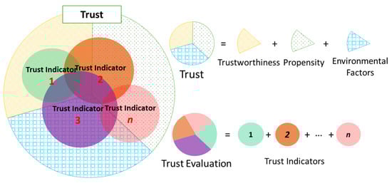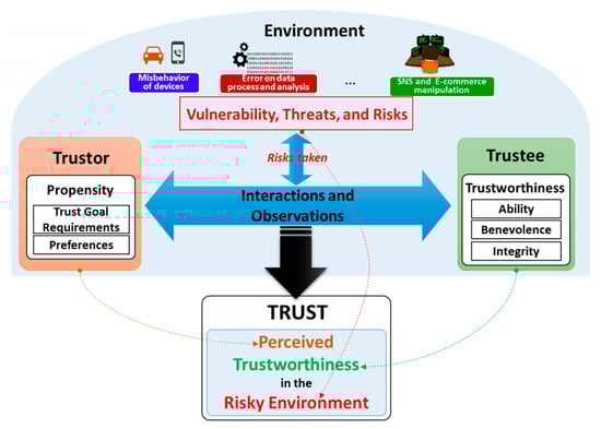 In the early years, most of IoT-related research articles have concentrated on RFID and Wireless Sensor Networks (WSNs) that aim at building underlying networking protocols, hardware and software components in order to enable interactions and communications among physical objects and cyber-space. However, a human-centric IoT environment in which human plays an important role in supporting application and services, are more and more perceptible. This is proven by the high rate of utilization of social phenomena and crowd intelligence when developing real-world IoT services. Consequently, the so-called Social Internet of Things (SIoT) has recently been proposed for illustrating the CPSS concept in which people are envisaged as an integral part of the IoT ecosystem [,]. However, the merging of physical objects, cyber components and humans in the SIoT will introduce new concerns for risks, privacy and security. Consequently, managing risk and securing the SIoT are broad in scope and pose greater challenges than the traditional privacy and security triad of integrity, confidentiality, and availability []. In this regard, trust is recognized as an important role in supporting both humans and services to overcome the perception of uncertainty and risk when making a decision.
