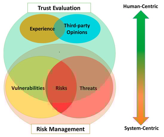The analysis of vulnerabilities, threats, and risks is also required in the trust evaluation but it is not necessarily fully involved as in the risk management. Instead, trust evaluation takes social-related factors (i.e., Experience and Third-party Opinions) into account when judging trust (Figure 4). Risk management assesses an entity (i.e., a computer system) from the perspective of a system (system-centric) while trust considers the entity (the trustee) under perspectives of a trustor, expressing a subjective view of the trustor on the trustee in an associated social context (human-centric).