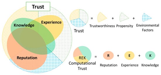 The earliest variant of trust in computer science is system security and data security that cover concepts of hardware, software and communications. A system is trustworthy if it is secure and not compromised, meaning that it identifies people accessing the system and only allows authorized users; and the data security ensures that data is only accessed by those authorized users even in the presence of adversaries. More than three decades ago, Thomson mentioned trust in his Turing Award lecture when writing a Unix program to be free of Trojan horses []. Security gets further complex in networked worlds such as the Internet and the IoT due to the increasing participants to systems throughout the networks, resulting in introducing more threats, vulnerability and risks. System security and data security are also more complicated when privacy is taken into account. For example, personal data security could be ensured (in some degree) but providers can use the data for their own purposes or sell to a third-party. In this case, data security might be compromised if the data owner’s intent for data usage is violated. One of the solutions is a trust-based access control mechanism for data sharing in the environment of Smart City that we have proposed in [].