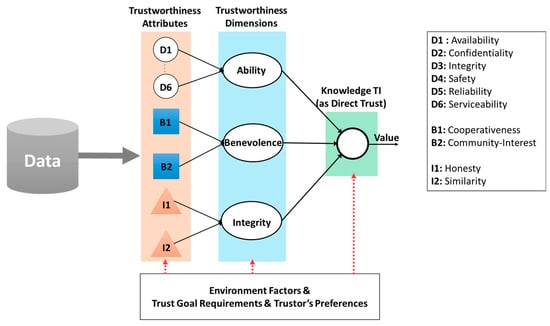 Some trust models attempt to assess trustee’s trustworthiness by introducing some TAs and associated evaluation mechanisms for generating a so-called trust. They indeed calculate direct trust that is a portion of the perceived trustworthiness. Researchers have pointed out that in some scenarios such as MANETs, due to high mobility, it is challenged to maintain a centralized system for managing third-party information, resulting in only direct observation information is possibly obtained; and they have to adapt the trust models based on constrains of the environments [,]. In these evaluation models, the direct trust consists of a set of manifold TAs that are necessary and sufficient for a trustor to quantify trust in a particular environment. The perceived trustworthiness is not required to cover all TAs, instead, the set of TAs should be deliberately chosen based on the trustor’s propensity and the environmental factors (even though in these articles, the trustor’s propensity and the environment characteristics are not mentioned). For example, when evaluating trustworthiness of sensor nodes in WSNs, Bao and Chen have used Cooperativeness, Community-Interest, and Honesty to judge whether a sensor node is malicious or not. These TAs help to evaluate trustworthiness of a sensor node in a WSN that contains some types of vulnerabilities and attacks []. The disadvantage of this approach is that the authors do not have a mechanism to combine such information to illustrate the subjectivity of trust. Thus, what they calculate is as an instance of entity’s trustworthiness. Y. Yu et al. in [] have analyzed various types of threats and attacks and variety of trust models in the WSN environment for secure routing protocols by characterizing many attributes of a secure system such as security mechanisms and attack preventing mechanisms. Li et al. in [] have used only local information about a node for evaluating trust, giving an incomplete partial trust for a trust management called Objective Trust Management Framework (OTMF) in MANETs environment. The novel idea is that they apply a modified Bayesian model using different weights assigned for each information obtained from direct observations. The information is collected using a watchdog mechanism; and in order to calculate weights for each kind of information, the OTMF floods all the observation information throughout the network. A node can rely on the observation from neighbors (called second-hand information) for determining its own weights. The problem of the mechanism is the generation of a significant amount of overhead to MANETs. In [,], the authors have mentioned about trust-related information extracted from the three layers of a networking system namely physical, core and application layers; and they use the information for quantifying trust. An inference engine based on fuzzy logics is used to infer a trust level. However, the drawback of this approach is only focusing on objective factors only but not subjective factors of trust. As a result, values they got from the computation mechanism do not reflect some key characteristics of trust, thus cannot quantify as trust. An interesting article is about judging trust based on several features extracted from social interactions such as spatiality, relative orientation, frequency of interactions, and duration of interactions []. However, this information is not sufficient to accurately derive trust due to a variety of assumptions on relations between trust and behaviors of entities which are sometimes not correct.