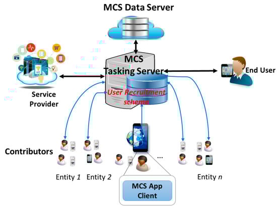 One of the challenges in MCS is the recruitment of contributors for sensing tasks [,]. In a crowded urban area with high number of participants, it is critical to recruit trustworthy users to collect high quality of data as well as to guarantee security, privacy and data integrity. This challenge calls for an efficient User Recruitment scheme implemented in the MCS Tasking Server for making proper selection of contributors respecting to a specific sensing task as illustrated in Figure 7 (the sensing task requested by service providers and assigned based on a mechanism deployed at the MCS []). Note that in order to recruit users evolving in a sensing task, the MCS Tasking Server should manage an incentive scheme as rewards for their contributions because users sustain costs (e.g., energy consumption, data subscription, and privacy and security breach) for accomplishing assigned sensing tasks. The User Recruitment scheme specifies criteria for user eligibility to contribute to a crowd-sensing campaign by judging whether a user accomplishes a sensing task as expected. In other words, the MCS Tasking Server chooses contributors as it trusts to fulfil the sensing task. Therefore, this use-case turns to a trust scenario as follows: